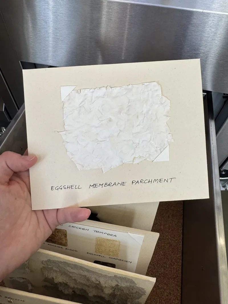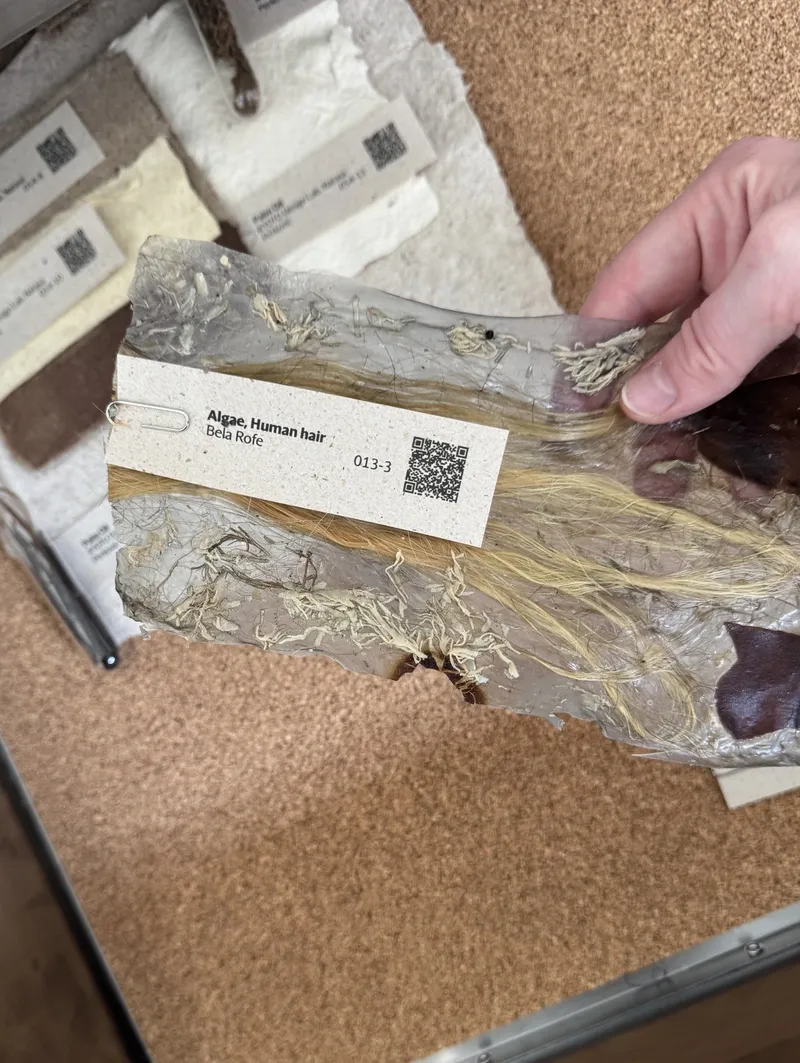 This April, together with HIAP and Bioart Society, we went on a field trip to the Jan Van Eyck Academie to explore the renowned Future Materials Lab. This project, dedicated to sustainable materials and material knowledge, features both an online database and a physical archive of material samples at the Academie’s premises, which reopened earlier this year. Food waste, fungi, human hair, potato starch, algae, gelatine—these are just a few of the raw materials that might serve in the future as sustainable alternatives to mass-produced materials like silicone, glass, or leather.